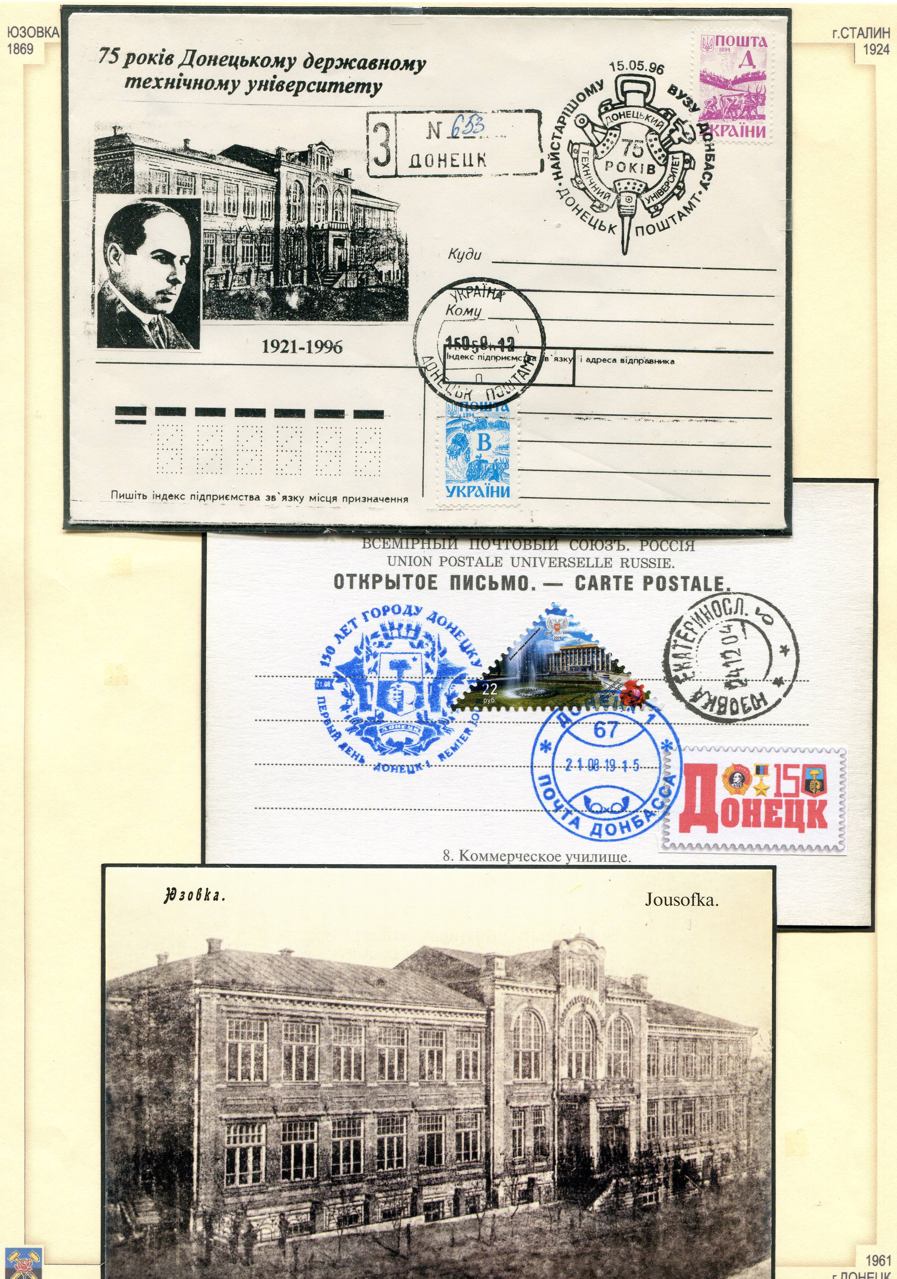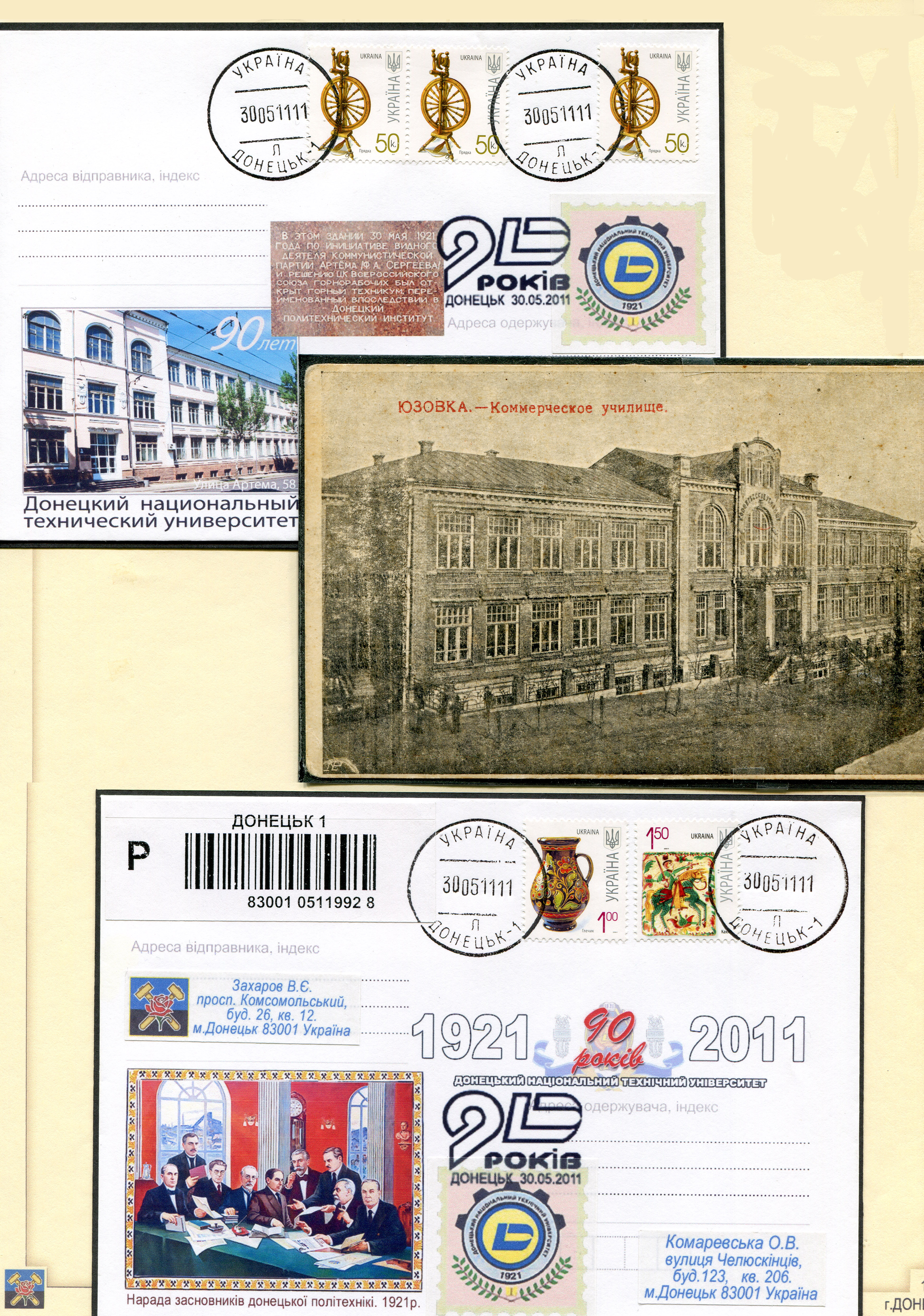 Первой в этом хронологическом ряду стоит дореволюционная почтовая открытка с изображением здания Коммерческого училища Юзовки, в котором 30 мая 1921 года был открыт Донецкий горный техникум – ныне ДонНТУ.