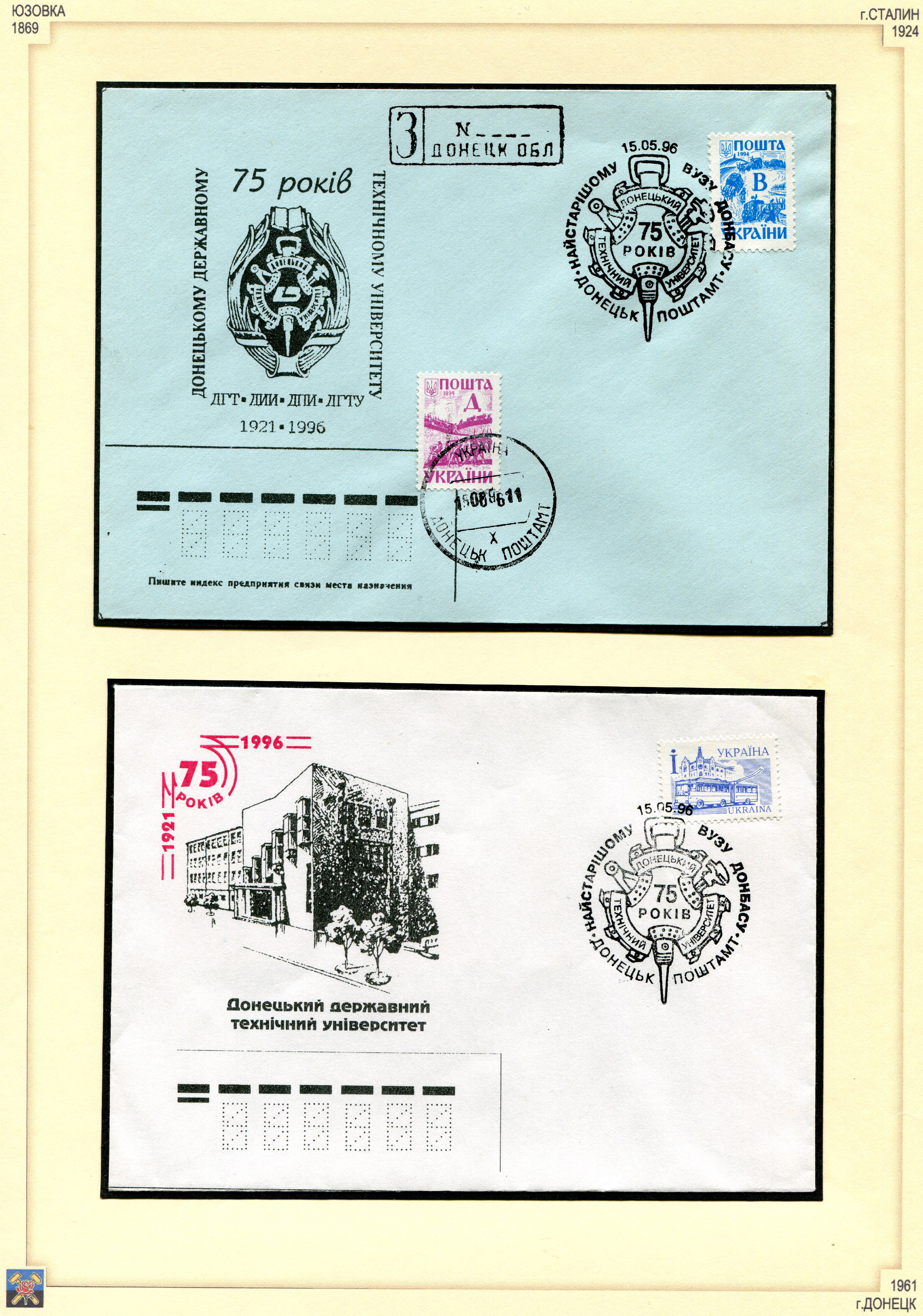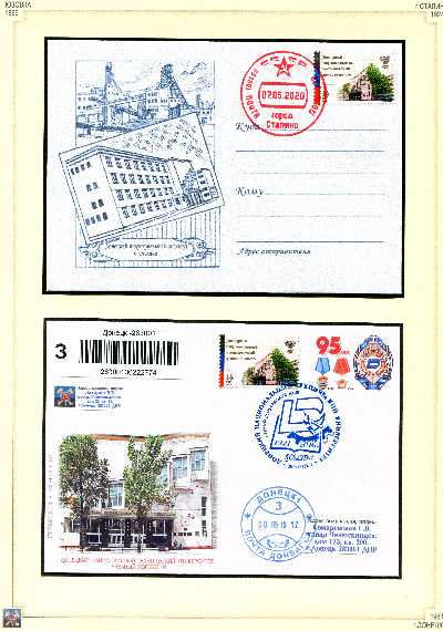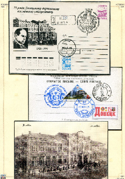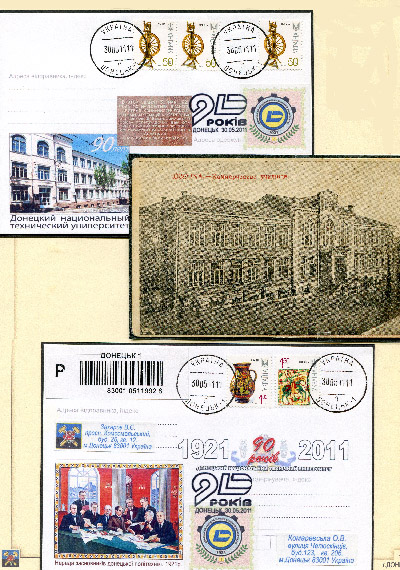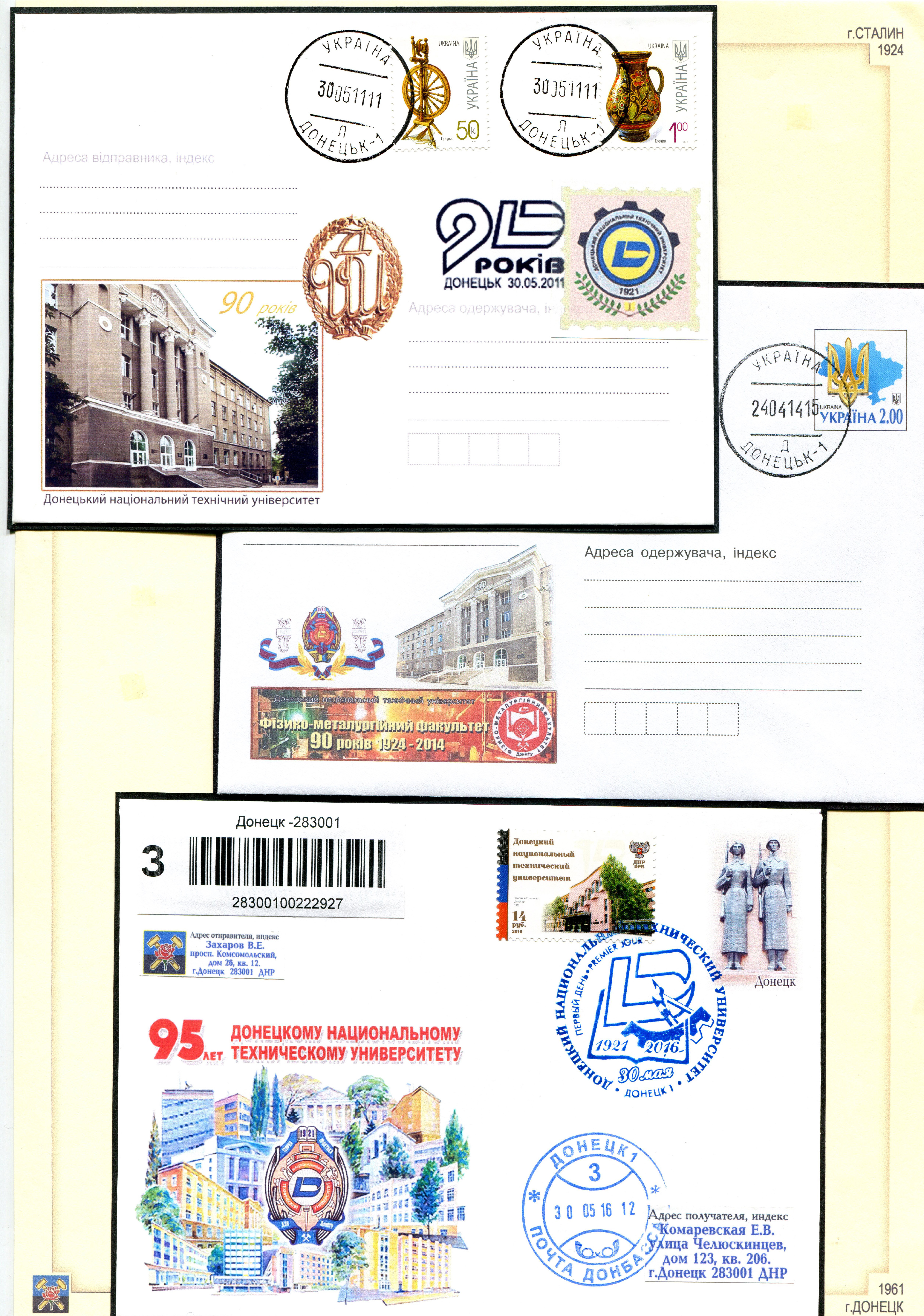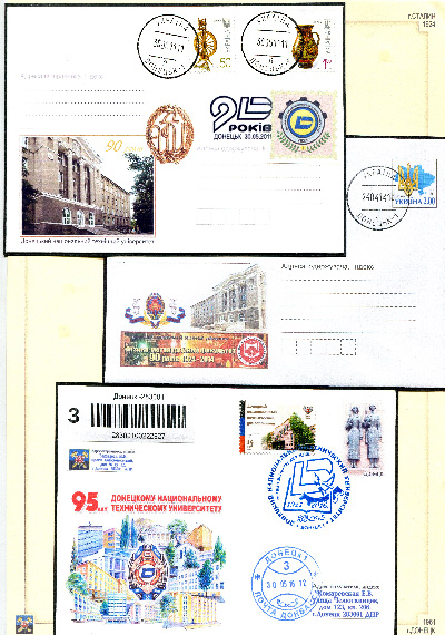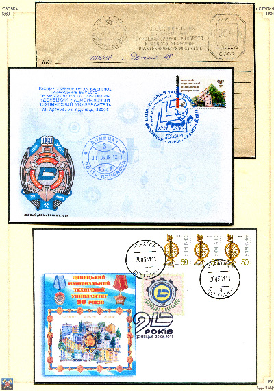 Следующей стоит почтовая карточка 1938 года издания, на которой помещена фотография первого учебного корпуса, построенного в 1931 году. Среди филателистических материалов советского периода следует отметить картмаксимум, состоящий из открытки 1968 года с видом на студенческий городок, почтовой марки и специального почтового штемпеля, посвященных 100-летию города Донецка. Представляют интерес два художественных маркированных конверта (ХМК), выпущенных в честь 50-летия вуза (1971 год) и 100-летия со дня рождения академика АН УССР В. С. Пака (1988 год), который 26 лет руководил кафедрой горной механики. На момент выхода в свет первого из упомянутых конвертов, Министерство связи СССР издало 7471 ХМК, из которых только восемь были посвящены предприятиям и учреждениям Донецкой области. Что касается второго конверта, то до его выпуска только трем ученым, деятельность которых была связана с Донбассом, были посвящены ХМК. Также этот конверт прошел специальное почтовое гашение в честь 100-летия со дня рождения ученого. Это одно из свидетельств заслуг вуза в подготовке инженерных кадров и его научных достижениях.