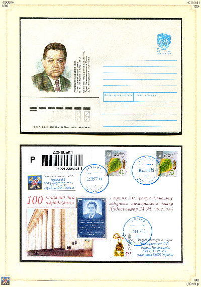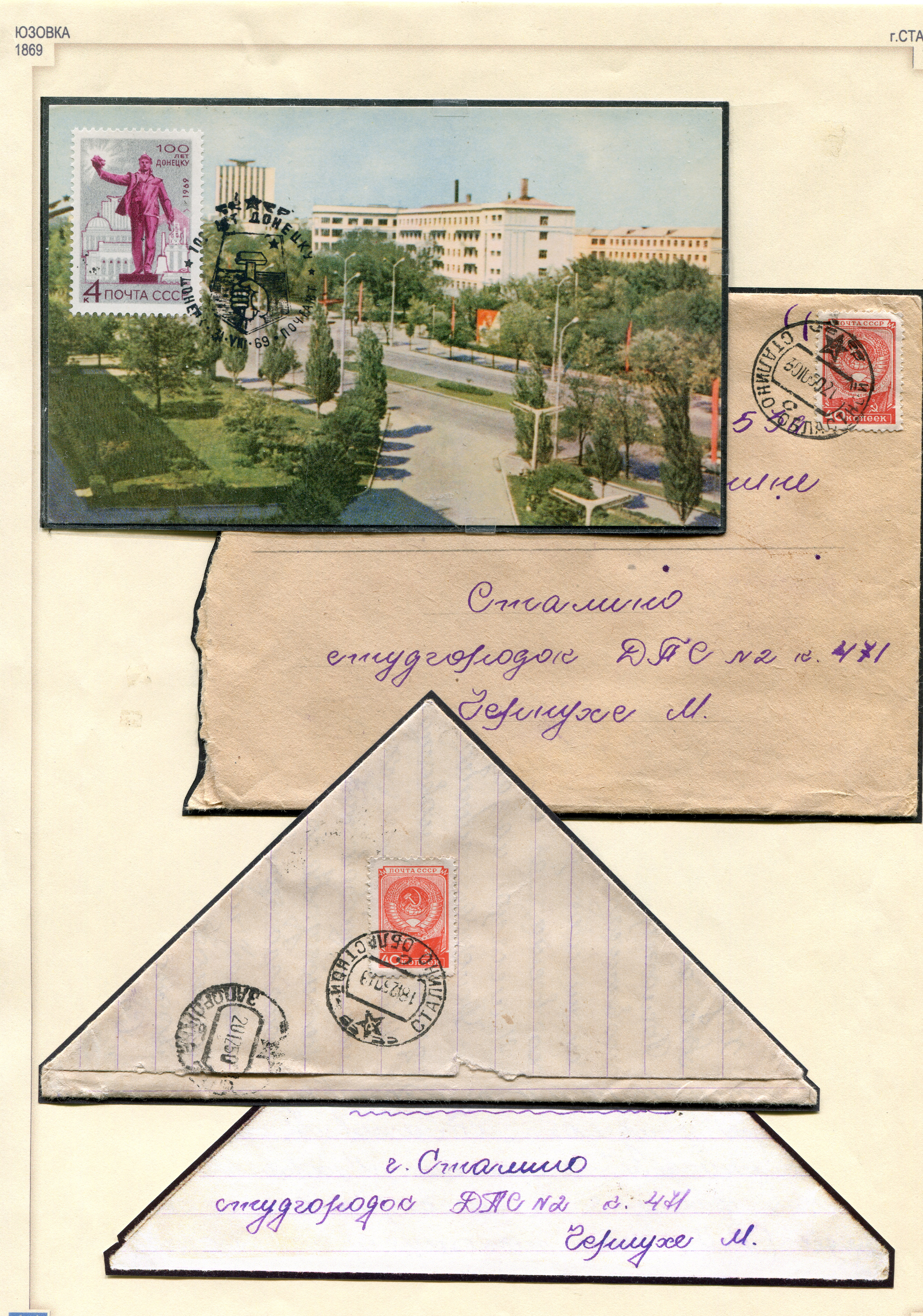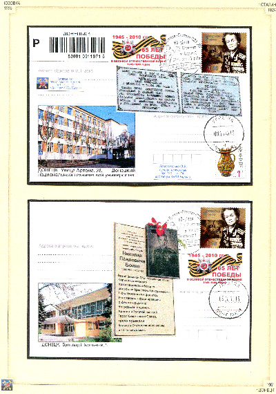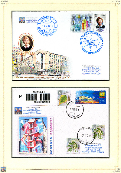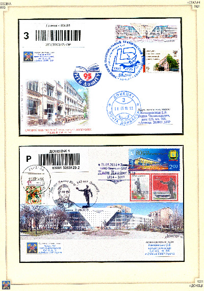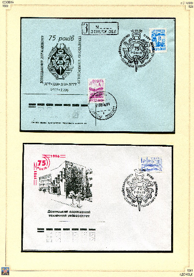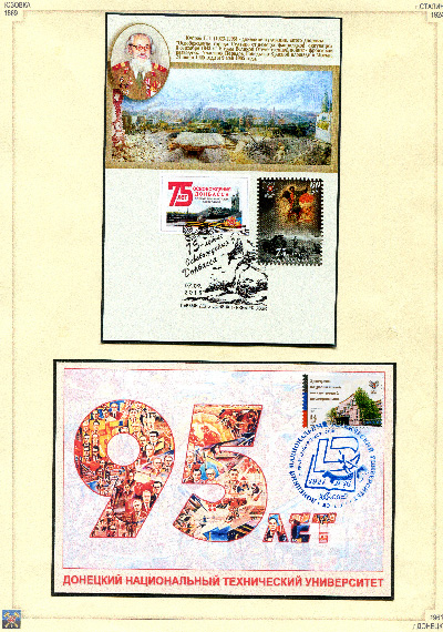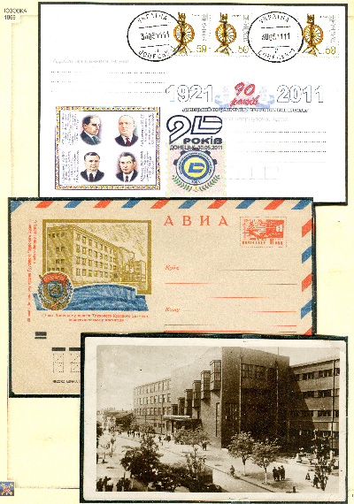 Следующей стоит почтовая карточка 1938 года издания, на которой помещена фотография первого учебного корпуса, построенного в 1931 году. Среди филателистических материалов советского периода следует отметить картмаксимум, состоящий из открытки 1968 года с видом на студенческий городок, почтовой марки и специального почтового штемпеля, посвященных 100-летию города Донецка. Представляют интерес два художественных маркированных конверта (ХМК), выпущенных в честь 50-летия вуза (1971 год) и 100-летия со дня рождения академика АН УССР В. С. Пака (1988 год), который 26 лет руководил кафедрой горной механики. На момент выхода в свет первого из упомянутых конвертов, Министерство связи СССР издало 7471 ХМК, из которых только восемь были посвящены предприятиям и учреждениям Донецкой области. Что касается второго конверта, то до его выпуска только трем ученым, деятельность которых была связана с Донбассом, были посвящены ХМК. Также этот конверт прошел специальное почтовое гашение в честь 100-летия со дня рождения ученого. Это одно из свидетельств заслуг вуза в подготовке инженерных кадров и его научных достижениях.
