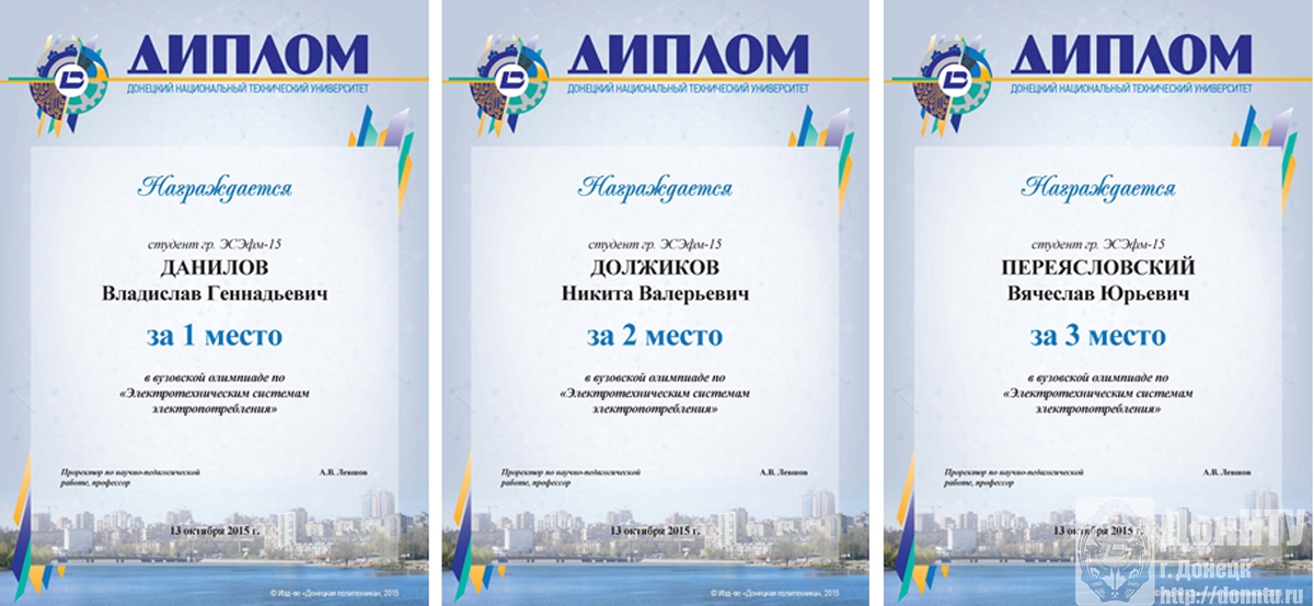 Жюри олимпиады приняло следующее решение наградить почетными дипломами ДонНТУ студентов, занявших призовые места, а также направить для участия в Международной студенческой олимпиаде по электроэнергетике «Электроэнергетика - 2015» им. А. Ф. Дьякова, которая пройдет с 18 по 21 ноября 2015 г. в Ивановском государственном энергетическом университете (Россия) студентов Должикова Н. В. и Переясловского В. Ю.