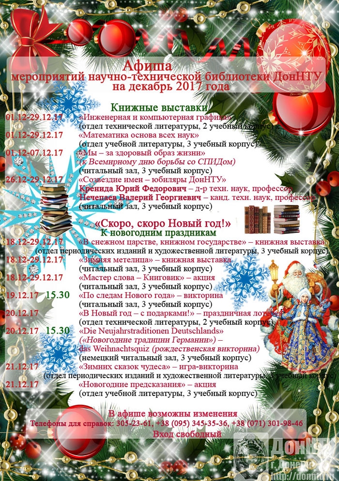 Познакомиться с афишей на декабрь 2017 года вы можете на сайте НТБ ДонНТУ в разделе «Библиоафиша».