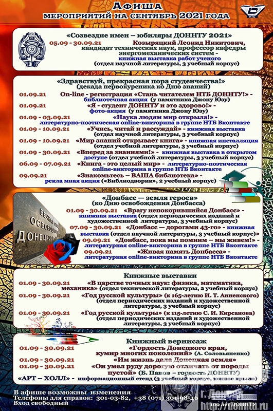 Ко Дню знаний и началу нового учебного года научно-техническая библиотека Донецкого национального технического университета подготовила Декаду первокурсника «Здравствуй, прекрасная пора студенчества!». В ее рамках пройдут интересные мероприятия: книжные выставки, инсталляции, викторины, акции.