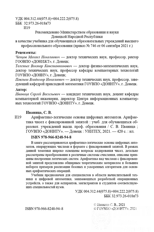 от 06.09.2021 года учебному изданию «Арифметико-логические основы цифровых автоматов. Арифметика чисел с фиксированной запятой» присвоен гриф «Рекомендовано Министерством образования и науки Донецкой Народной Республики».