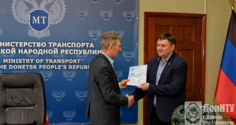 В Министерстве транспорта ДНР 1 февраля состоялось торжественное вручение аттестатов и удостоверений экспертов преподавателям Автомобильно-дорожного института Донецкого национального технического университета, аккредитованным в Системе сертификации на транспорте и в дорожном хозяйстве (ДОНТРАНССЕРТ). Церемонию награждения провел заместитель министра транспорта А. В. Сало.
