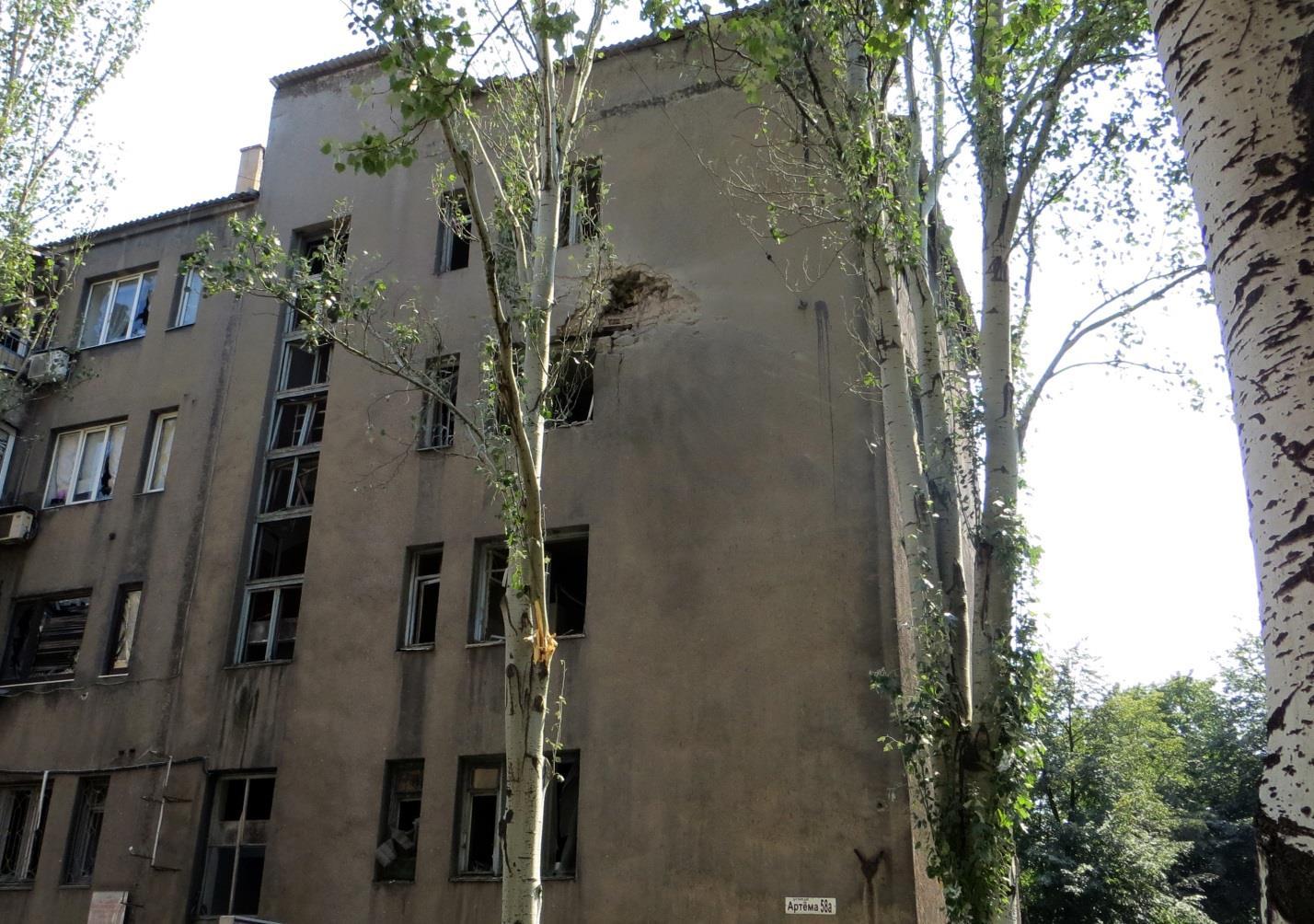 Повреждено было также расположенное поблизости здание Донецкой городской клинической больницы No1 (больницы Вишневского). Фотографии этого обстрела, представленные на рисунке 2 и широко разошедшиеся по средствам массовой информации (СМИ) и социальным сетям, стали, фактически, первыми общедоступными документами, где были четко и недвусмысленно зафиксированы целенаправленные артиллерийские удары непосредственно по жилому сектору города. О том, что это не могли быть случайные залеты отдельных снарядов, свидетельствовало очень многое. Например, то, что утром и днем 7 августа над Донецком были зафиксированы полеты разведывательных самолетов, несколько раз прошло звено штурмовиков (тогда они еще позволяли себе летать над городом). Явно также было видно, что это был прицельный артиллерийский удар со стороны украинских сил в районе аэропорта, а не минометный, что особенно важно в свете того, что не прекращались пропагандистские попытки с украинской стороны обвинить в использовании для ударов по городу «блуждающих минометов» сил ополчения якобы для дискредитации украинских военных.