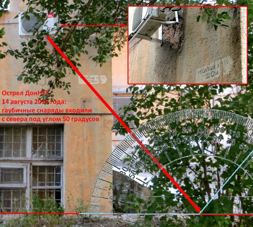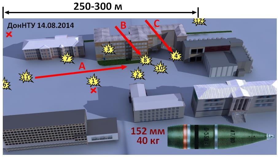 Фотофиксация основных мест попаданий позволила составить детальную карту всех попаданий (рис. 17), по которой однозначно можно было определить источник обстрела с точностью до нескольких угловых градусов. Результаты анализа по горячим следам были опубликованы в социальных сетях, что получило определенный информационный резонанс и практически сразу же (правда, ненадолго) пресекло типичные для того и последующего времени измышления украинской пропаганды о том, что «они сами себя обстреливают, чтобы дискредитировать доблестную украинскую армию».