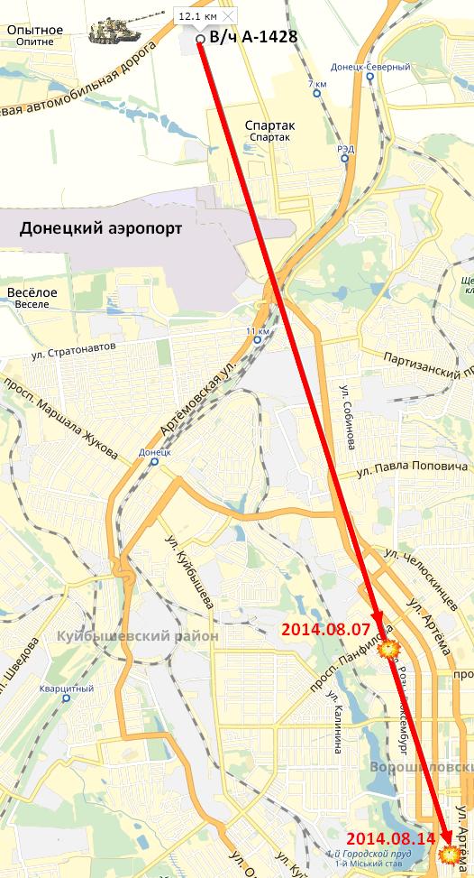 Правда, постоянная дислокация 152-мм артиллерии там не фиксировалось (рис. 26), но имеются многочисленные свидетельства ее периодического там пребывания. Тем более, что именно оттуда за неделю до обстрела ДонНТУ 152-мм снарядами были обстреляны жилые высотки на ул. Розы Люксембург (рис. 25), а через несколько дней после обстрела ДонНТУ – территория Донецкого металлургического завода, где также погибли гражданские.
