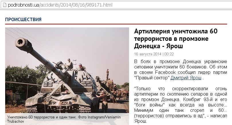 Неопровержимым доказательством украинских обстрелов Донецка из 152-мм гаубиц в эти дни являются многочисленные новостные публикации в украинских СМИ, сопровождаемые, как правило, снимками 152-мм САУ «Мста», которые, по всей видимости, и использовались при обстреле (рис. 27). Эти многочисленные свидетельства доступны и сейчас, через несколько лет после обстрела. Достаточно сделать поисковый запрос «Артиллерия уничтожила 60 террористов в Донецке» или, например, «Ярош заявил об уничтожении 60 ополченцев». Сами ополченцы и тогда, и сейчас уверенно утверждают, что именно в те дни ни их позиции, ни промзоны Донецка, такому интенсивному 152-мм артиллерийскому обстрелу как это имело место в ДонНТУ, не подвергались – снаряды как обычно в те дни летели через их головы в центр города и в жилой сектор на окраинах.