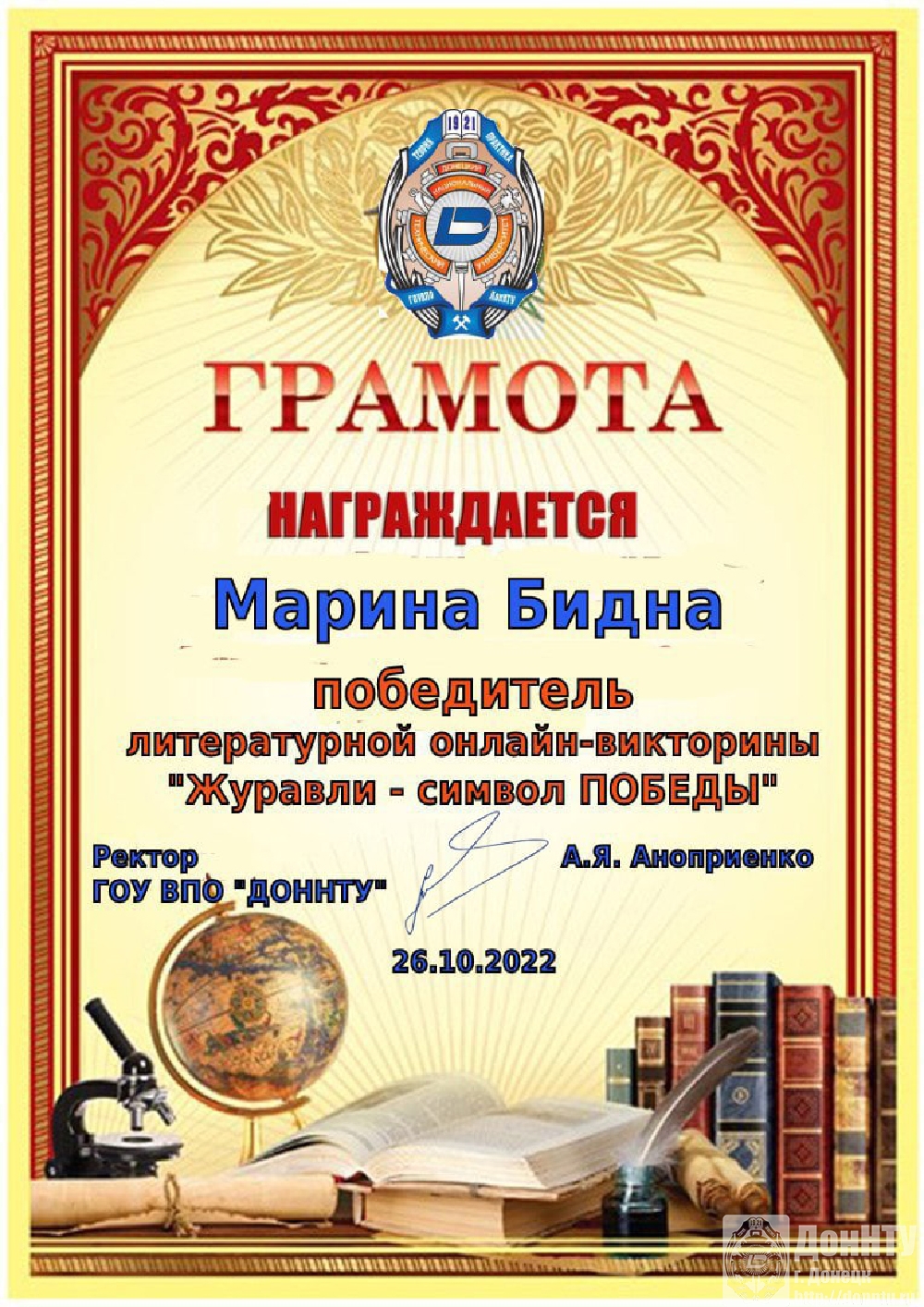 В научно-технической библиотеке ДонНТУ 21–22 октября состоялась литературная онлайн-викторина «Журавли – символ Победы», приуроченная к Международному дню белых журавлей, инициатором которого является народный поэт Дагестана Расул Гамзатов.