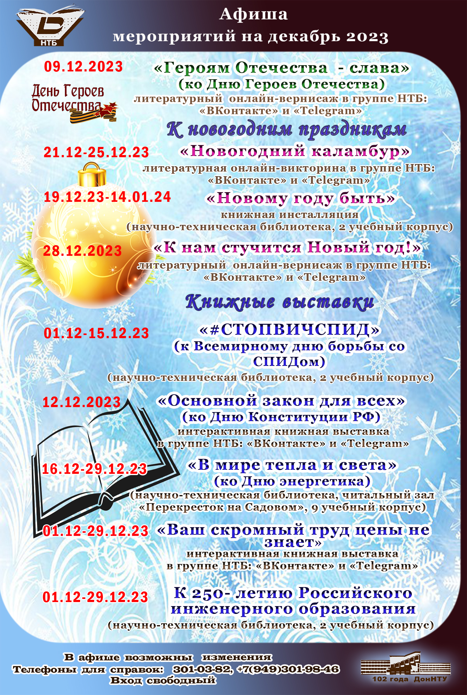Научно-техническая библиотека ДонНТУ предлагает вашему вниманию афишу мероприятий на декабрь к знаменательным датам, историческим и культурным событиям.
