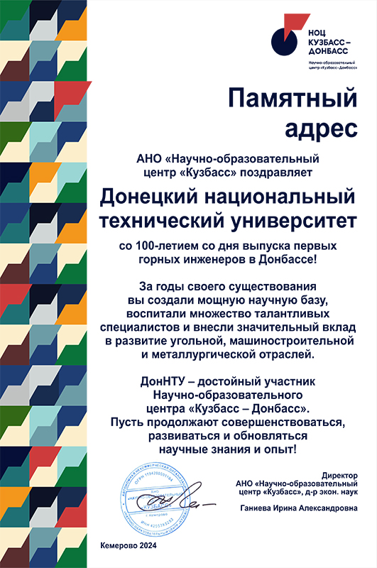 Научно-образовательный центр «Кузбасс» поздравляет ДонНТУ со 100-летием со дня выпуска первых горных инженеров в Донбассе!