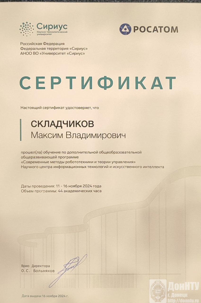 В университете «Сириус» 11–16 ноября прошла программа «Современные методы робототехники и теория управления». От Донецкого национального технического университета в ней принял участие аспирант Максим Складчиков. За время обучения он приобрёл очень ценный опыт, открыл для себя новые горизонты современных технологий, увидел, как искусственный интеллект и робототехника формируют будущее и как эти знания применяются на практике. Талантливые преподаватели и менторы делились своими знаниями, помогали разбираться в сложных темах и вдохновляли на создание собственных разработок, а также учили, как применять теоретические знания в реальных проектах. Все участники программы были объединены общим интересом, они успешно решали задачи и добивались реальных результатов. Мероприятие оставило много впечатлений: от волнения перед сложностью материала до восторга, когда начинаешь понимать и применять теорию управления в реальных сценариях. Это обучение открыло двери в мир высоких технологий.