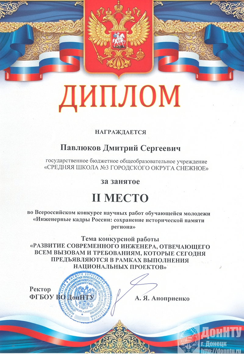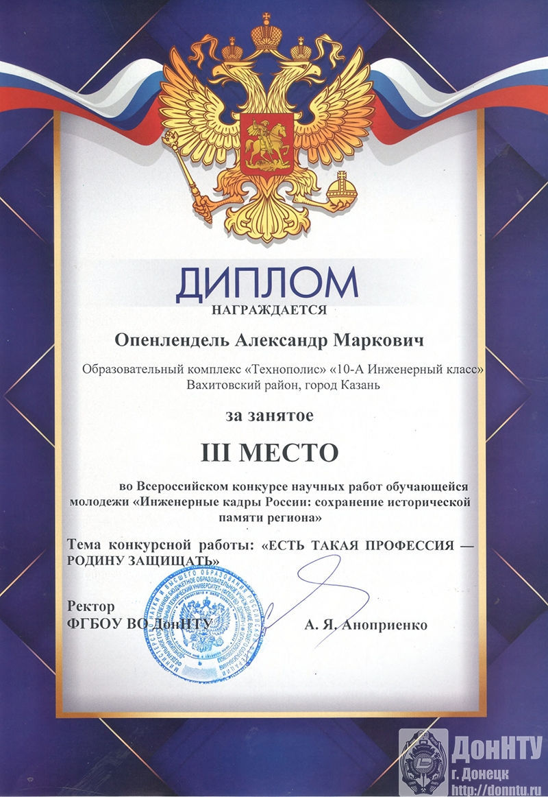 – Артур Поляков, «Вклад инженеров Донецкой Народной Республики в экономику Российской Федерации», 8 «Б» класс донецкого лицея «Коллеж».