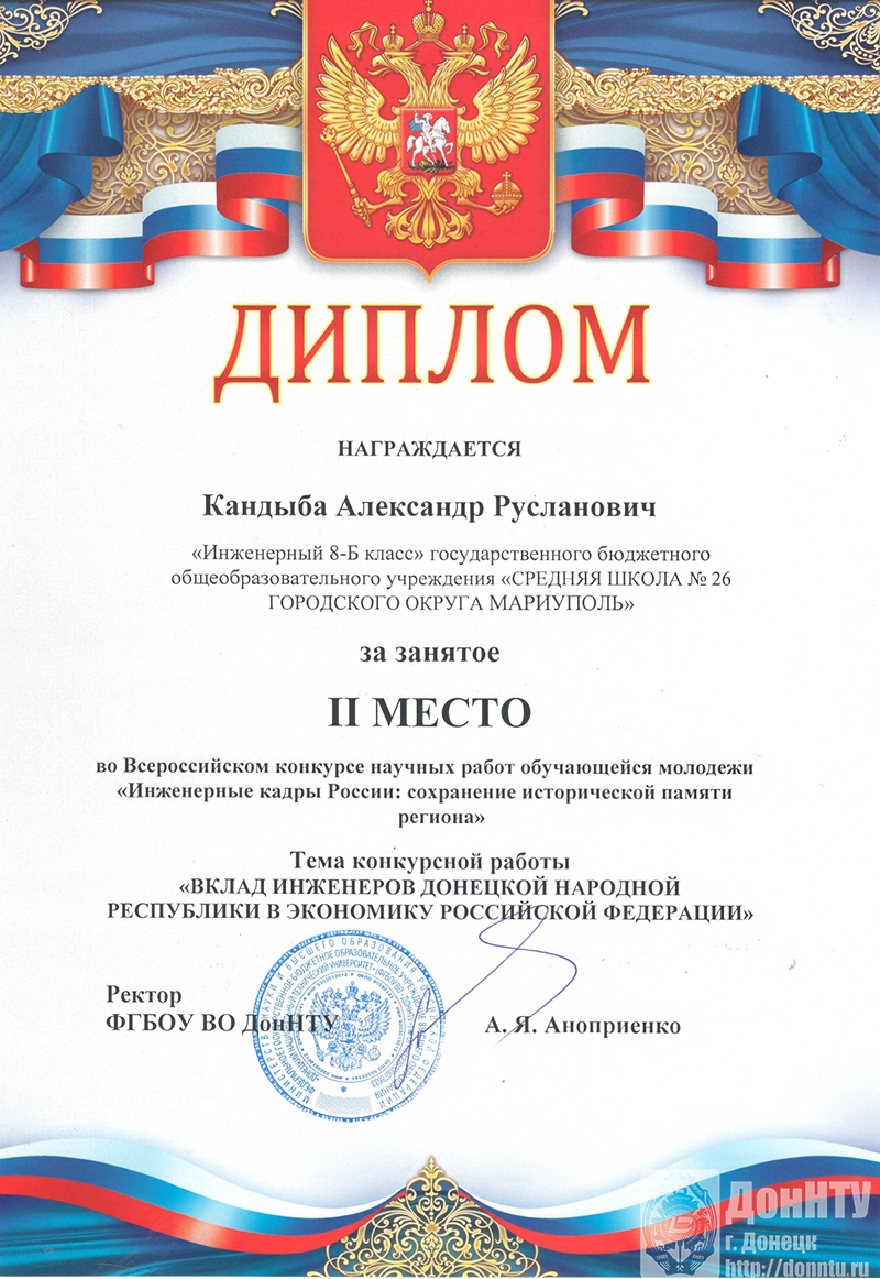 – Александр Кандыба, «Вклад инженеров Донецкой Народной Республики в экономику Российской Федерации», «Инженерный 8-Б класс» средней школы № 26 г. о. Мариуполь.