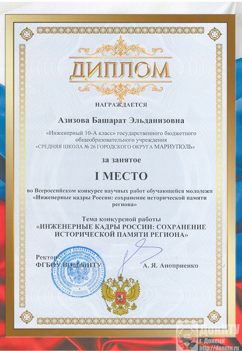 – Башарат Азизова, «Инженерные кадры России: сохранение исторической памяти региона», «Инженерный 10-А класс» средней школы № 26 г. о. Мариуполь;