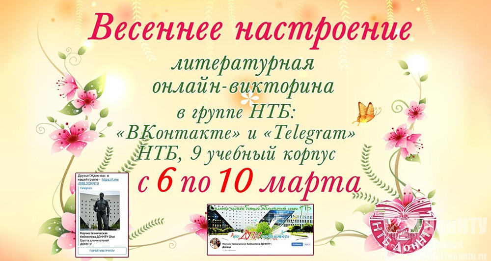 - принять участие в литературной онлайн-викторине «Весеннее настроение» (группы НТБ ДонНТУ и , 6–10 марта).