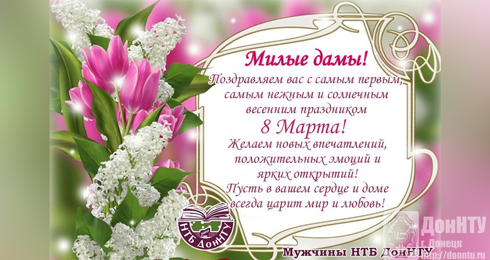 Милые дамы, девушки, девочки! Поздравляем вас с праздником весны, очарования, красоты и женственности! Желаем любви с радостью, таланта с вдохновением, а счастья – с воодушевлением!