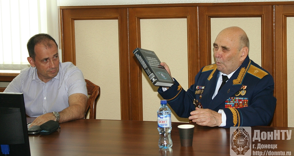 Проректор ДонНТУ Андрей Николаевич Рязанов познакомил с богатой историей университета, его научными достижениями, а заведующий кафедрой радиотехники и защиты информации Владимир Владимирович Паслён – с направлениями деятельности его подразделения. Валерию Александровичу Меньшикову была вручена книга о ректорах ДИИ–ДПИ–ДонНТУ, а он, в свою очередь, подарил вузу авторское издание «Основы анализа и проектирования космических систем мониторинга и прогнозирования природных и техногенных катастроф». На встрече были также обсуждены вопросы возможного сотрудничества в образовательной и научной сферах.