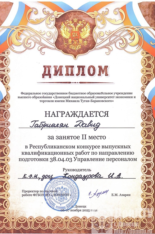 Выпускники кафедры управления бизнесом и персоналом ДонНТУ традиционно одержали победу в Республиканском конкурсе выпускных работ по образовательным программам бакалавриата и магистратуры по направлениям подготовки 38.03.03 и 38.04.03 «Управление персоналом», который состоялся 6-7 ноября на базе Донецкого национального университета экономики и торговли имени Михаила Туган-Барановского.