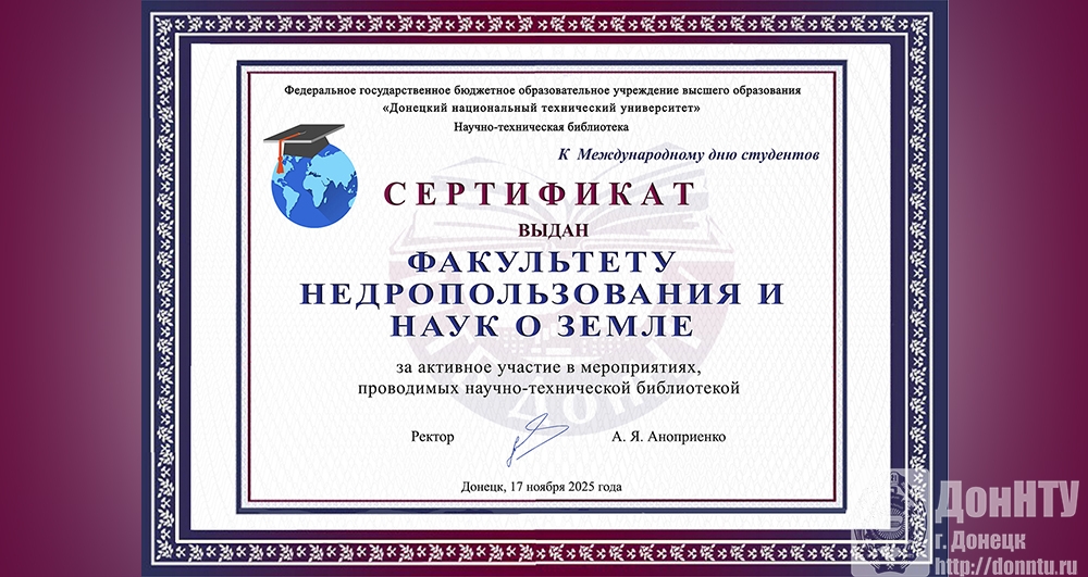 ФННЗ был награждён сертификатом участника, а декан факультета Ирина Викторовна Филатова и её заместитель Александр Владимирович Хохуля были удостоены благодарности ректора ДонНТУ