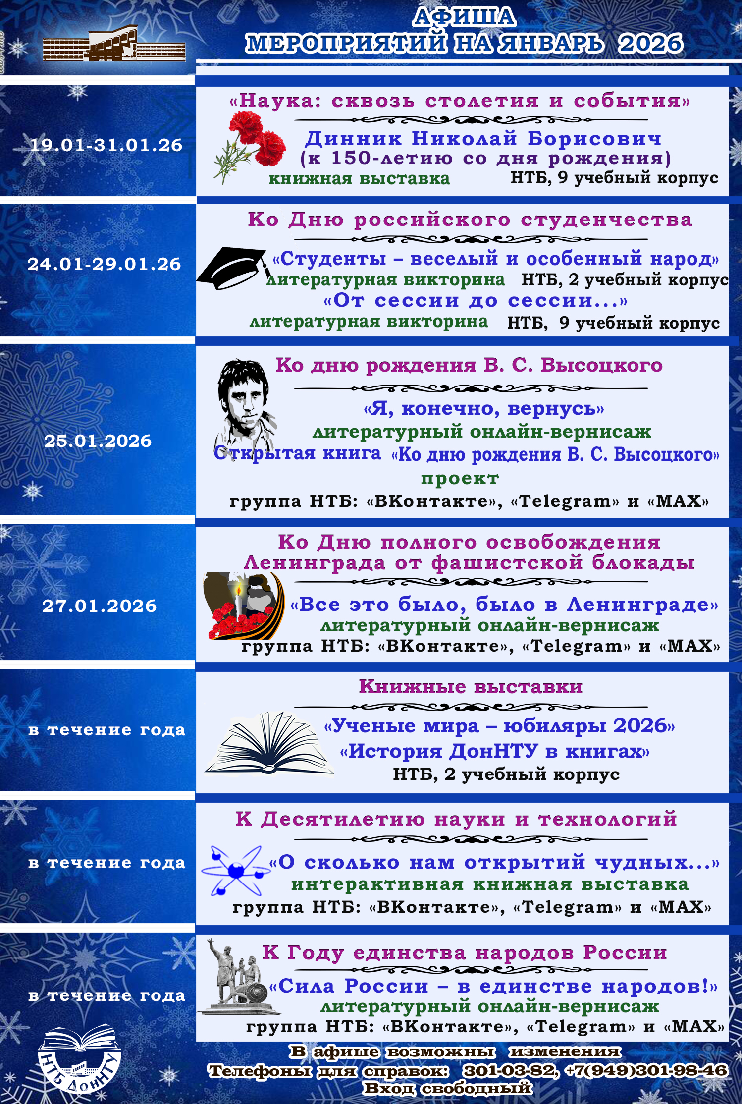 Научно-техническая библиотека ДонНТУ предлагает вашему вниманию афишу на январь 2026 года к знаменательным датам, историческим и культурным событиям: