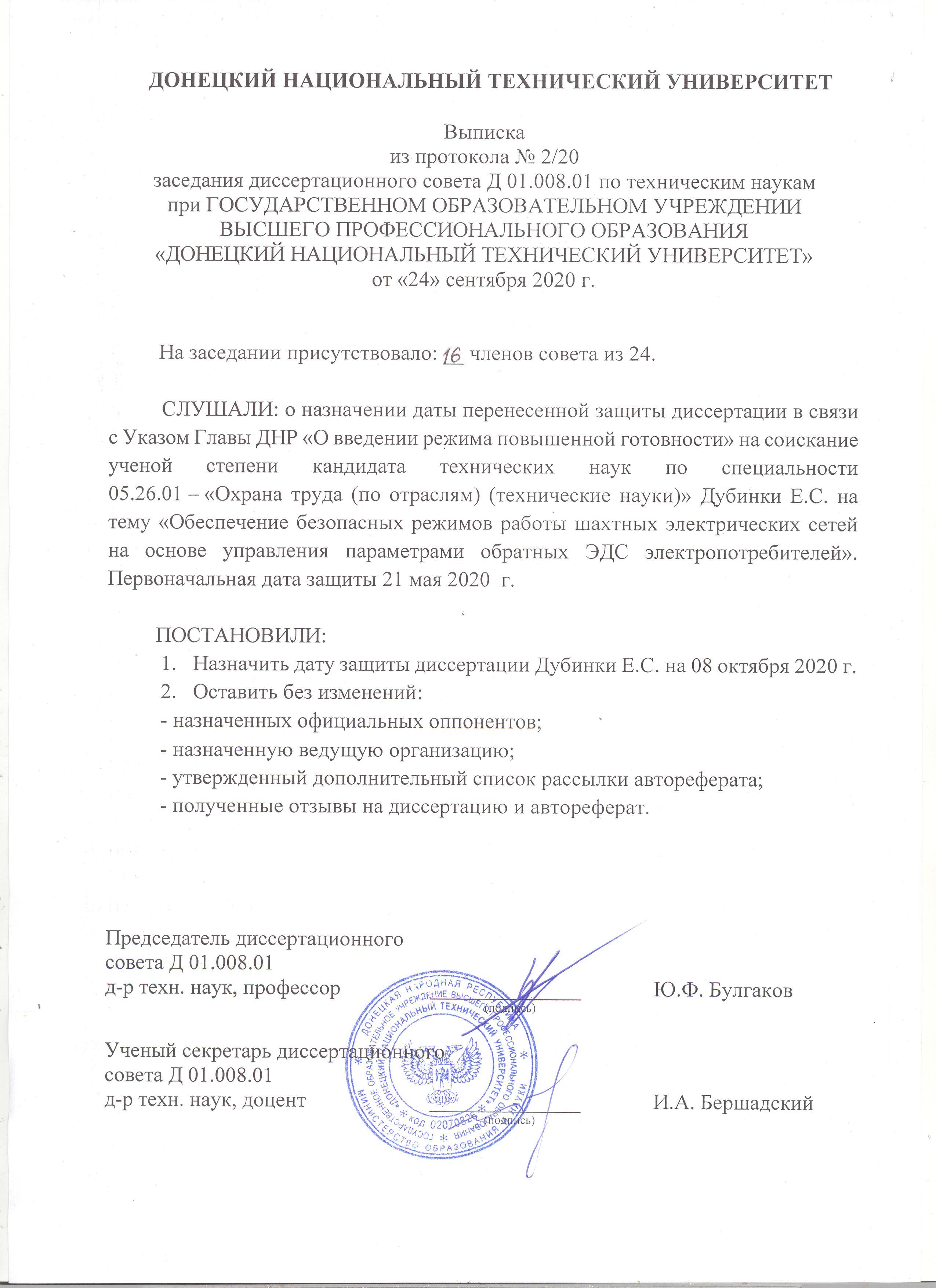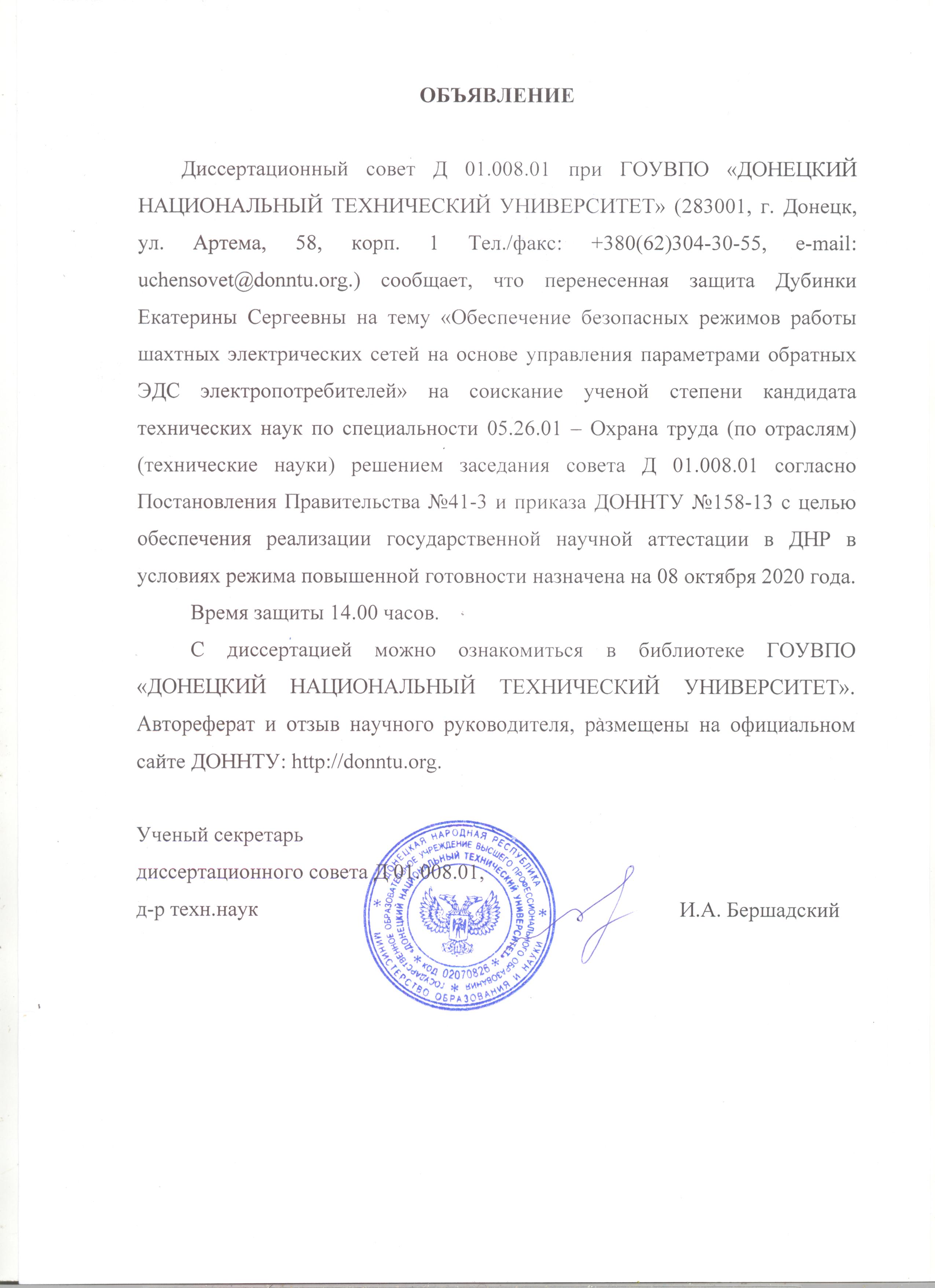 В связи с угрозой распространения в Донецкой Народной Республике новой коронавирусной инфекции, вызванной 2019–nCoV, диссертационный совет Д 01.008.01 при ГОСУДАРСТВЕННОМ ОБРАЗОВАТЕЛЬНОМ УЧРЕЖДЕНИИ ВЫСШЕГО ПРОФЕССИОНАЛЬНОГО ОБРАЗОВАНИЯ «ДОНЕЦКИЙ НАЦИОНАЛЬНЫЙ ТЕХНИЧЕКИЙ УНИВЕРСИТЕТ» объявляет, что защита диссертации Дубинка Екатерина Сергеевнана тему «Обеспечение безопасных режимов работы шахтных электрических сетей на основе управления параметрами обратных ЭДС электропотребителей» по специальности 05.26.01 – Охрана труда (по отраслям) (технические науки), на соискание ученой степени кандидата технических наук, которая должна была состояться 21.05.2020 г., переносится до особого распоряжения на основании: Письма Министерства образования и науки Донецкой Народной Республики «О переносе заседаний диссертационных советов» от 20.03.2020 № 862/18.1-28; п.2.3, п.3 Приказа Министерства образования и науки Донецкой Народной Республики «Об организации работы учреждений сферы образования и науки Донецкой Народной Республики» от 18.03.2020 № 502; Приказа по университету № 63-13 от 03.04.2020.