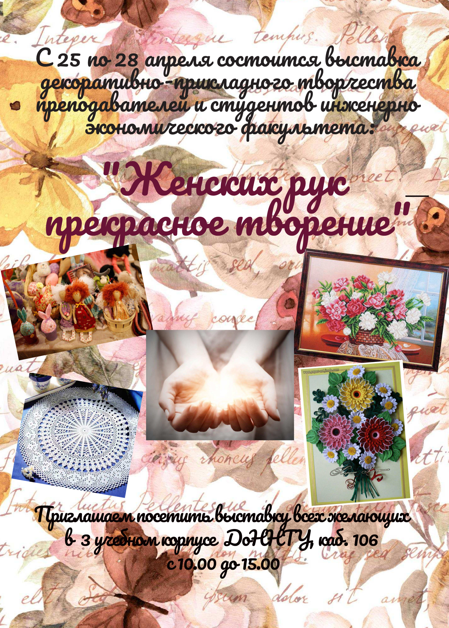С 25 по 28 апреля состоится выставка декоративно-прикладного творчества преподавателей и студентов инженерно-экономического факультета «Женских рук прекрасное творенье».