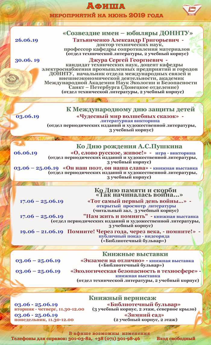 Научно-техническая библиотека предлагает вашему вниманию афишу мероприятий на июнь к знаменательным историческим и культурным событиям.