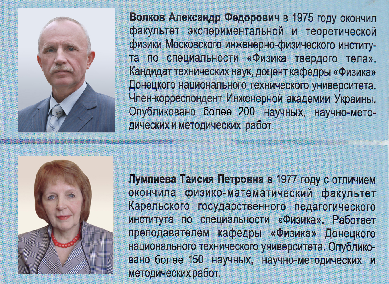 Представители кафедры физики Донецкого национального технического университета профессор А. Ф. Волков и доцент Т. П. Лумпиева стали лауреатами Всероссийского конкурса на лучшую научную книгу 2019 года в номинации «Технические науки» за книгу «Курс физики».