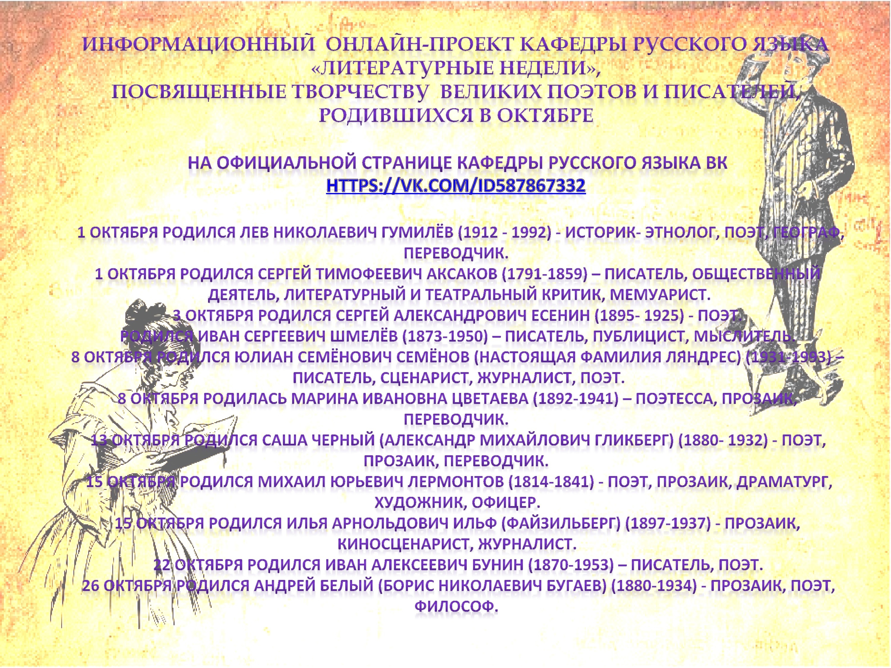 Кафедра русского языка Донецкого национального технического университета приглашает поучаствовать в информационном онлайн-проекте «Литературные недели», посвященном творчеству великих поэтов и писателей, родившихся в октябре. Ознакомиться с проектом можно на официальной странице кафедры русского языка ДонНТУ.