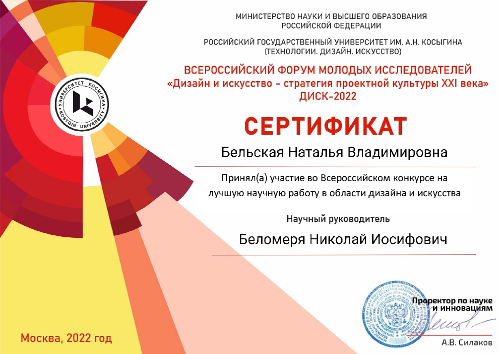 На базе Российского государственного университета им. А. Н. Косыгина с 14 по 17 ноября состоялась выставка-конкурс на лучшую научную работу в области дизайна и искусства в рамках Всероссийского форума молодых исследователей «Дизайн и искусство – стратегия проектной культуры 21 века» (ДИСК-2022). В секции «Дизайн архитектурной среды» отборочного тура конкурса приняла участие магистрант кафедры прикладной экологии и охраны окружающей среды факультета металлургии и теплоэнергетики Наталья Бельская (гр. ТТМм-21; научный руководитель канд. техн. наук Н. И. Беломеря) с экспонатом «Безопасный витраж». Итоги конкурса организаторами будут опубликованы в январе 2023 г.