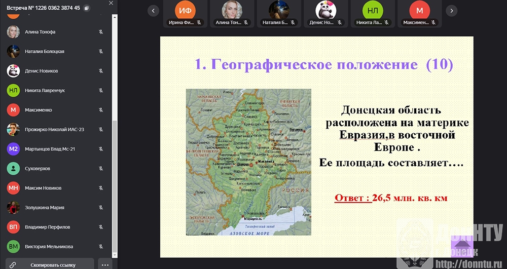 В викторине приняли участие активисты молодёжного клуба РГО «Донбасс» – студенты группы ИАС-23 факультета информационных систем и технологий, а также групп Мс-19, Мс-20, Мс-21, Мс-22 кафедры маркшейдерского дела имени Д. Н. Оглоблина. Несмотря на то, что мероприятие прошло в дистанционном формате, среди игроков царила напряжённая, но в то же время доброжелательная атмосфера. Все участники работали дружно и слаженно, внимательно слушали вопросы, рассуждали, пытались логически подойти к решению заданий, поддерживали друг друга, выслушивали точку зрения каждого члена команды.