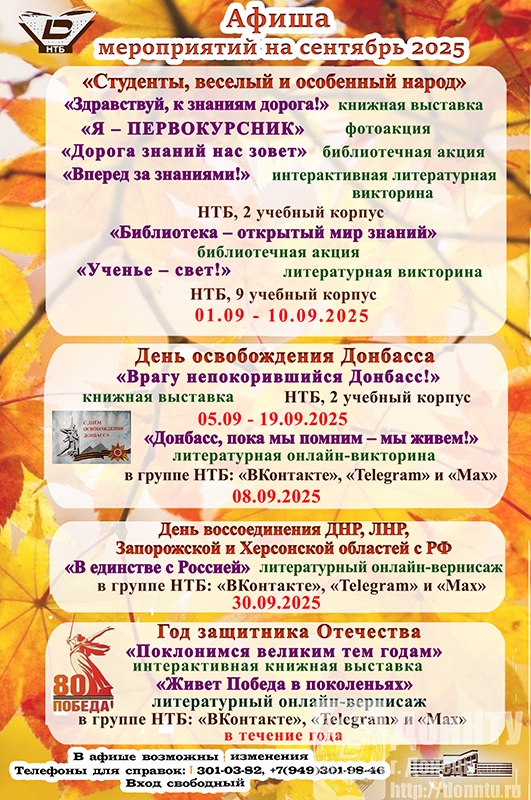 Научно-техническая библиотека ДонНТУ предлагает вашему вниманию афишу на сентябрь к знаменательным датам, историческим, культурным событиям.