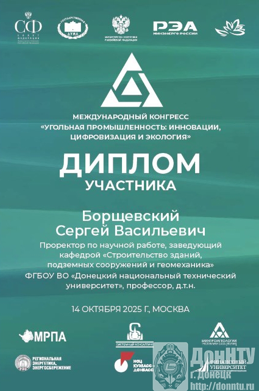 Проректор Донецкого национального технического университета Сергей Васильевич Борщевский и декан горного факультета вуза Александр Николаевич Корчевский приняли участие в конгрессе в качестве модераторов и представили доклад «Технико-технологические аспекты комплексной утилизации техногенных отходов, как фактора улучшения экологической составляющей угольного промышленного сектора ДНР». Их исследование получило высокую оценку участников и членов оргкомитета, которые отметили, что они разработали уже комплексную программу решения экологических проблем ДНР.