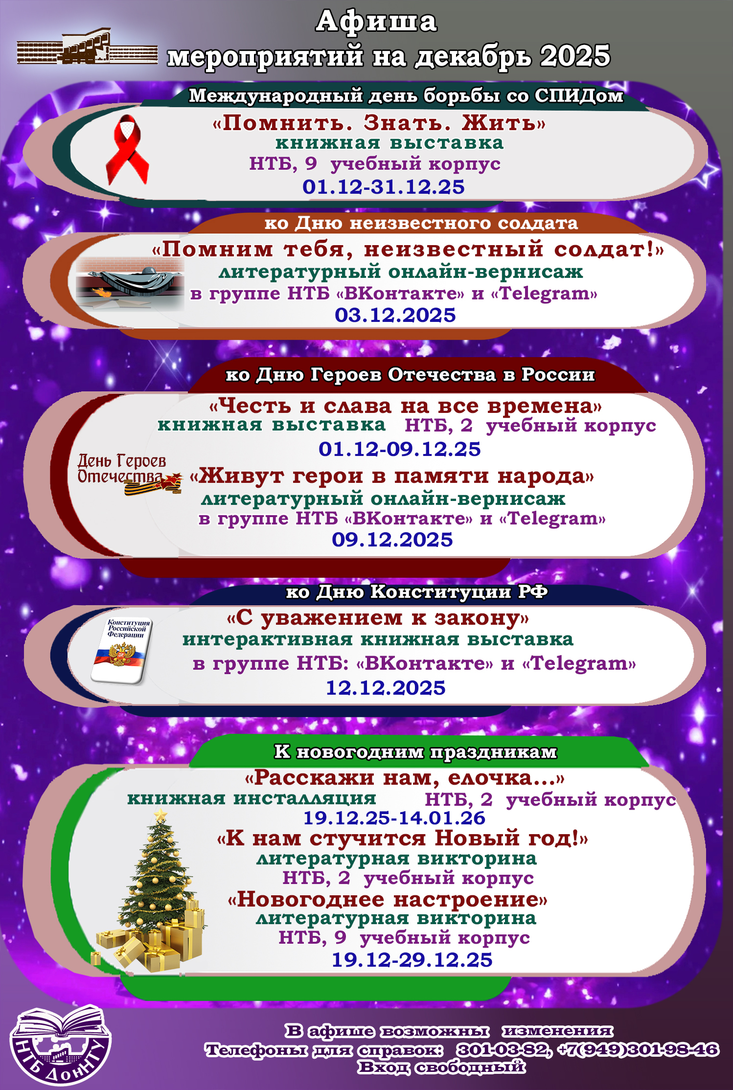 – к Международному дню борьбы со СПИДом ознакомиться с книжной выставкой «Помнить. Знать. Жить…» (читальный зал «Перекресток на Садовом», 9 учебный корпус, 1–31 декабря);