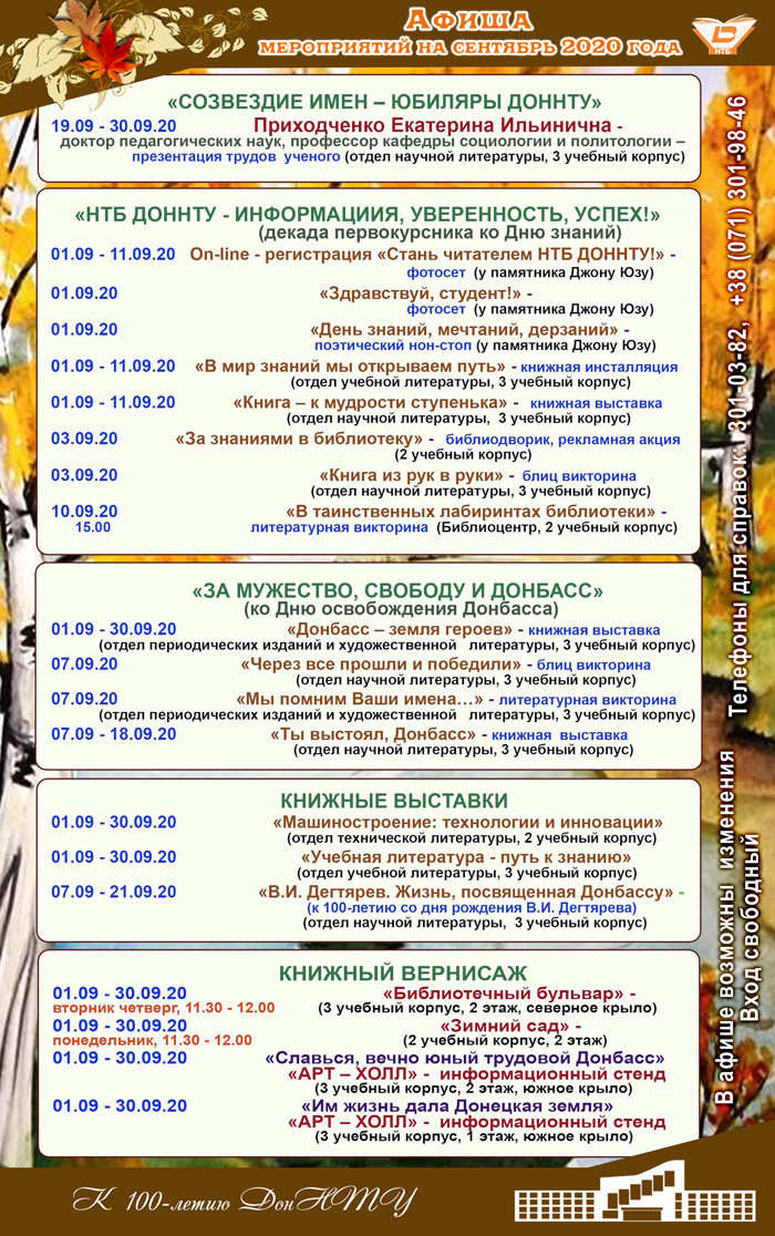 Ознакомиться с афишей на сентябрь вы можете на сайте НТБ ДонНТУ в разделе «Библиоафиша».