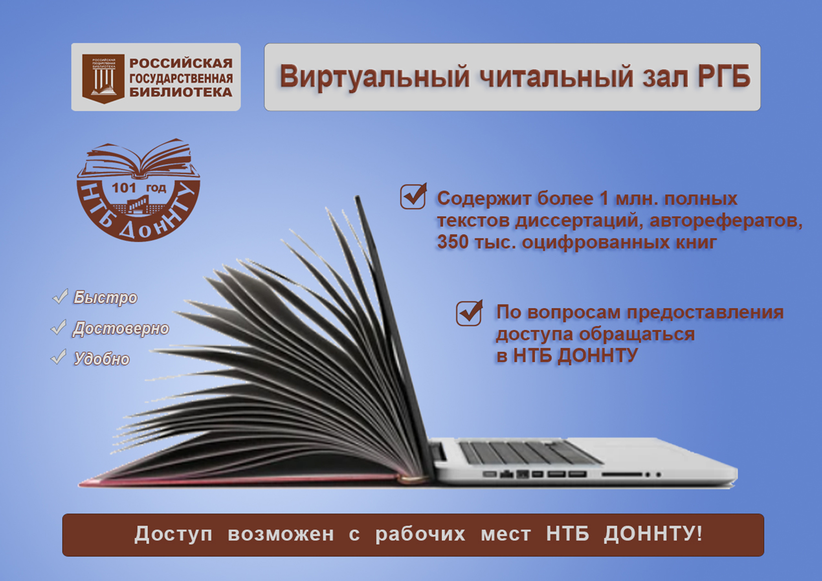 Донецкому национальному техническому университету открыт доступ к Виртуальному читальному залу Российской государственной библиотеки, который содержит более 1 млн полных текстов диссертаций, авторефератов, 350 тыс. оцифрованных книг.