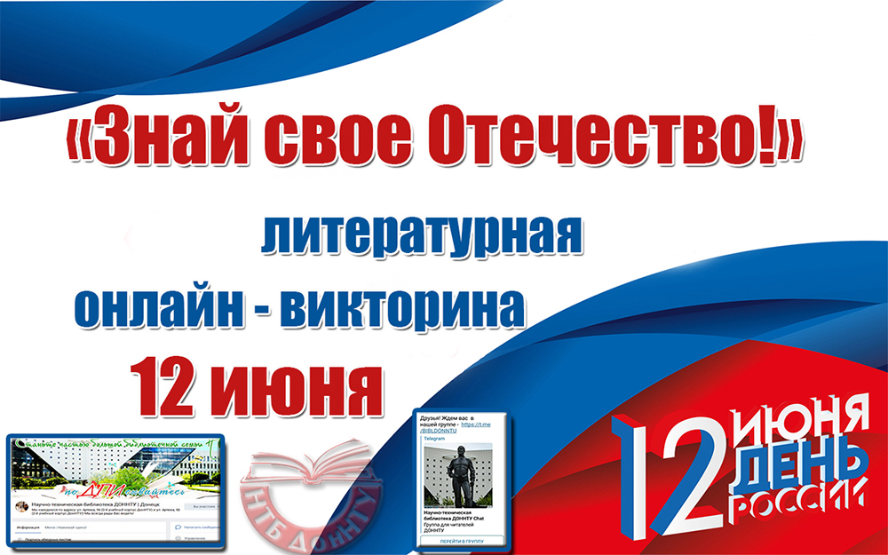 К этому знаменательному событию научно-техническая библиотека подготовила онлайн-викторину «Знай своё Отечество!», которая пройдёт 12 июня в группе НТБ и . Принять участие в мероприятии могут все желающие независимо от возраста и места проживания. Давайте проверим, много ли мы знаем о нашей Родине – России.