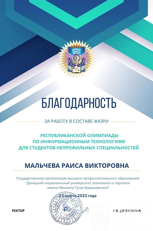Преподаватели факультета интеллектуальных систем и программирования Р. В. Мальчева, доцент кафедры компьютерной инженерии, и А. В. Боднар, доцент кафедры программной инженерии им. Л. П. Фельдмана, приняли участие в составе жюри олимпиады по информационным технологиям для студентов непрофильных специальностей, которая прошла в дистанционном формате на базе Донецкого национального университета экономики и торговли им. Михаила Туган-Барановского.