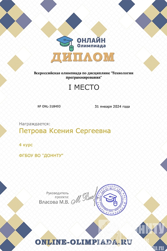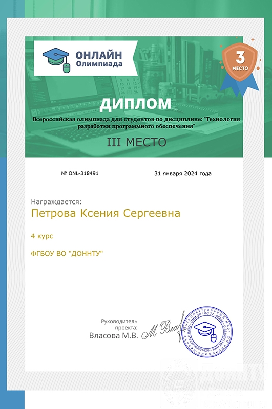 Студентка кафедры АСУ Ксения Петрова в осеннем семестре 2023–2024 учебного года активно участвовала в учебных и научных всероссийских мероприятиях. Ректор университета Александр Яковлевич Аноприенко поздравил её с победой на Всероссийской онлайн-олимпиаде по дисциплине «Технологии программирования», а также с третьим местом по дисциплине «Технологии разработки программного обеспечения». Ксения также приняла участие во II Международной научно-методической конференции «Наука, образование, транспорт: актуальные вопросы, приоритеты, векторы взаимодействия», в Международной просветительской акции «Географический диктант». Ректор вручил студентке грамоту за успехи в учебной и научно-исследовательской деятельности и свою книгу «Нооритмы. Модели синхронизации человека и космоса».