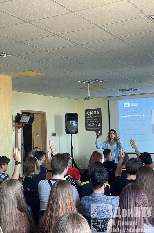 23 сентября кандидат искусствоведения, доцент кафедры мировой и отечественной культуры Донецкого государственного университета Марина Анатольевна Малыхина провела увлекательное занятие по ораторскому искусству. Лекция вызвала большой интерес у студентов, а её практическая часть помогла ребятам лучше узнать друг друга и научиться проводить короткую самопрезентацию. Самые активные участники получили призы. Также 23 сентября состоялась встреча с представителями первичного отделения организации «Движение Первых», многие первокурсники изъявили желание стать её активистами.